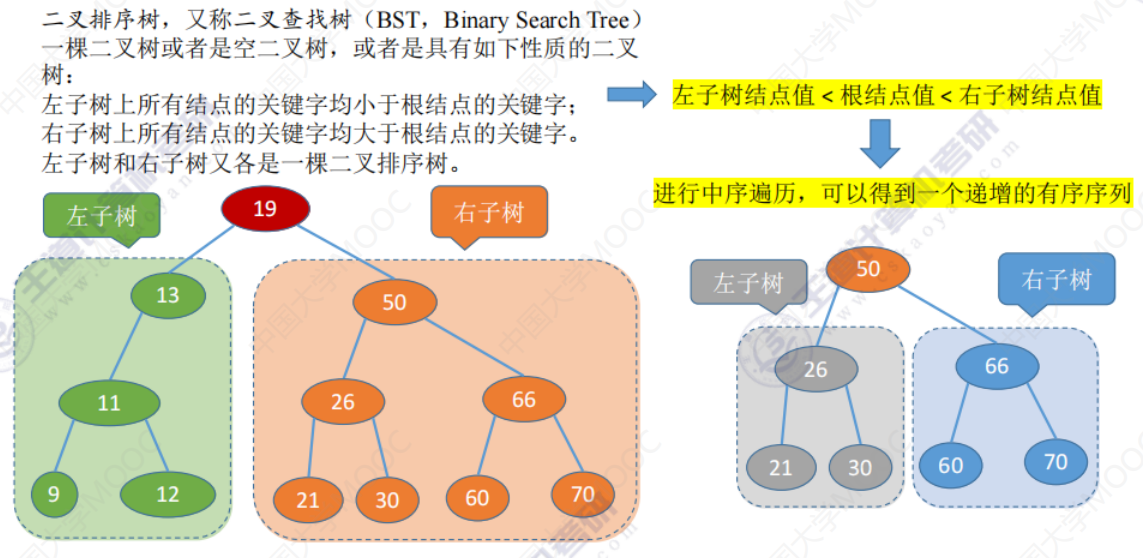 - 若右子树非空,则右子树上所有结点的值均大于根结点的值