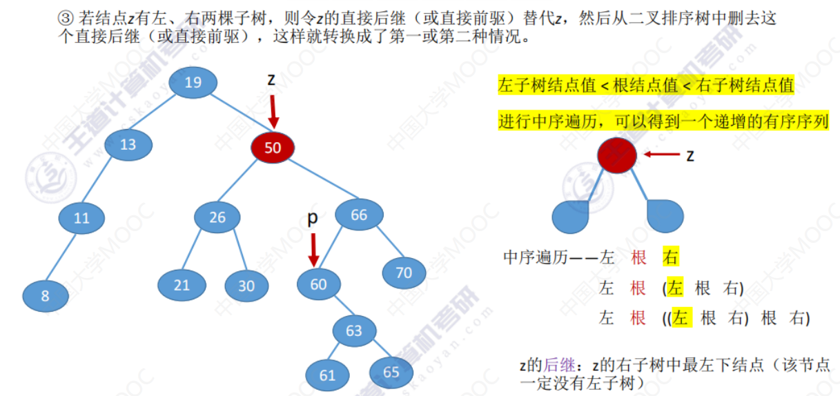 - 令z的直接后继代替z,然后从二叉排序树中删去这个直接后继。z的直接后继–>z的右子树中最左下结点(该结点一定没有左子树)