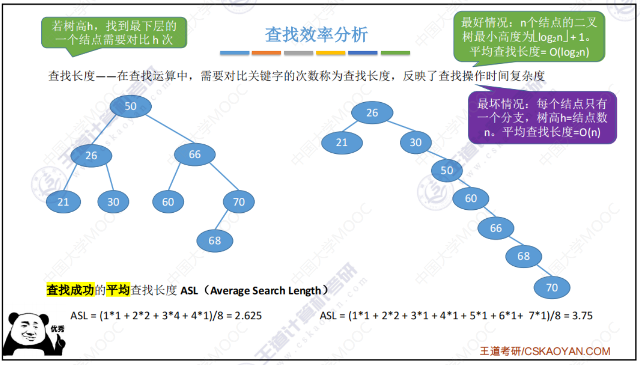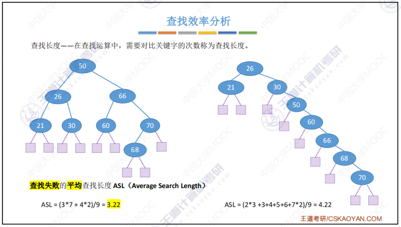 - 如果比较结果为根结点的关键字值较小,则说明该关键字可能存在其右子树中;