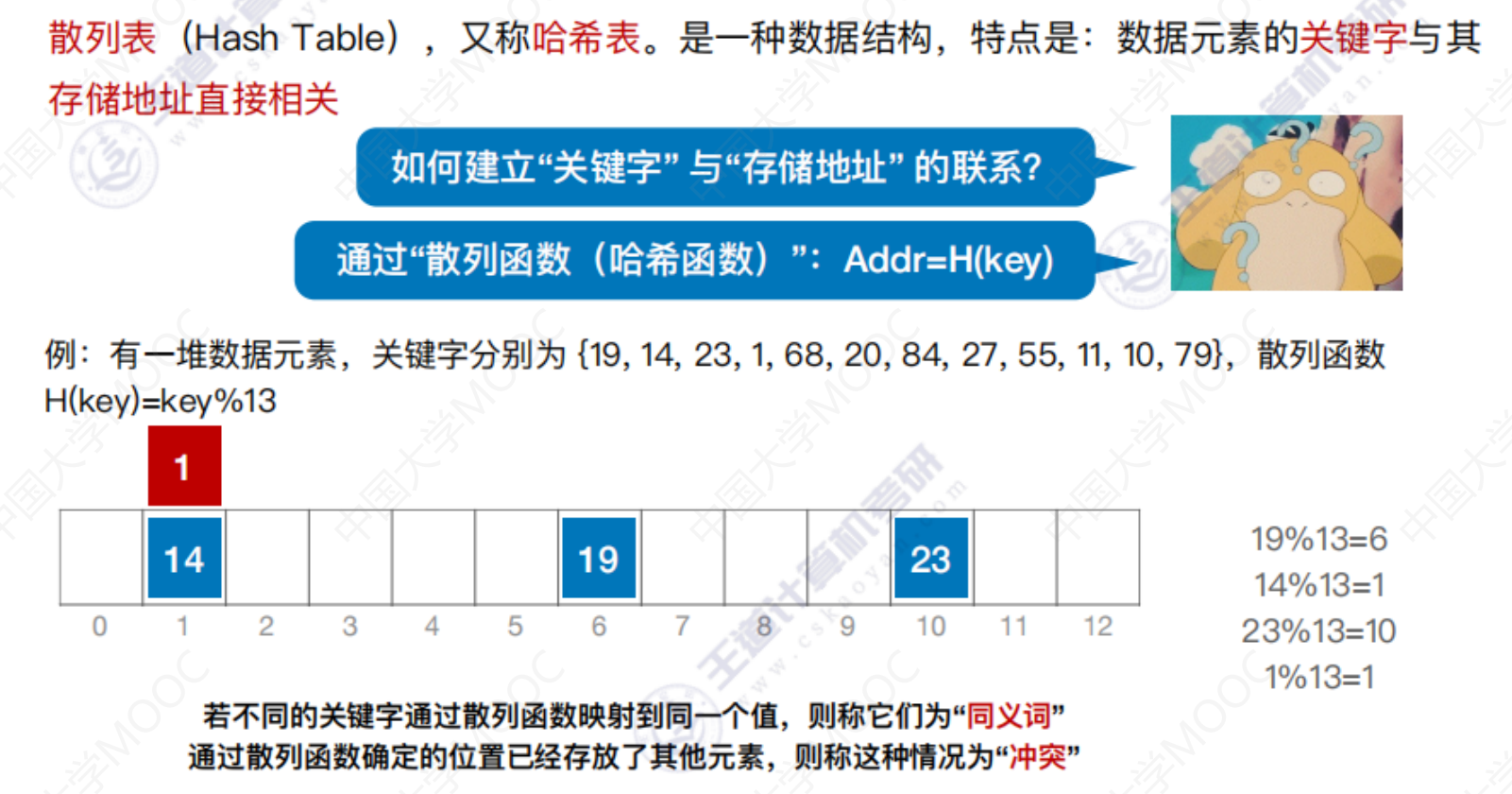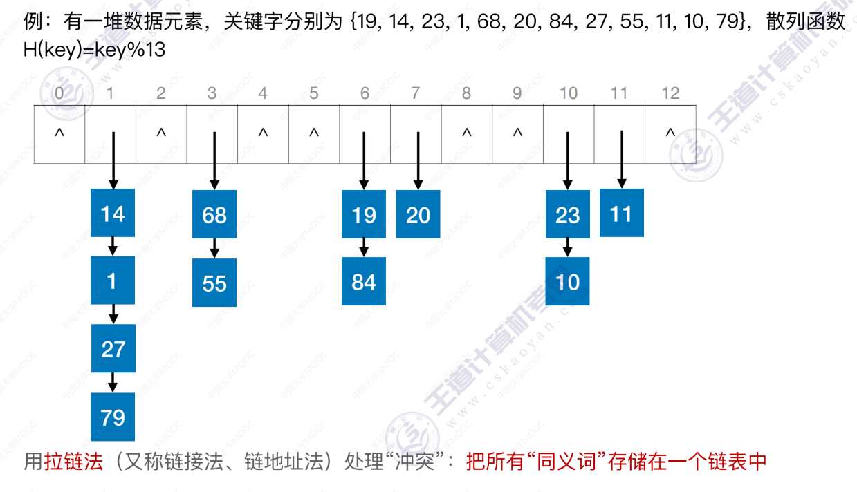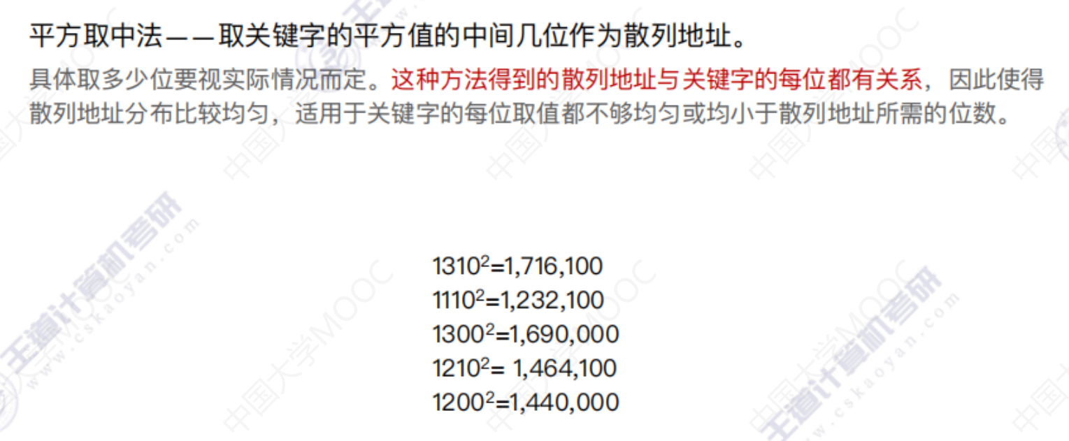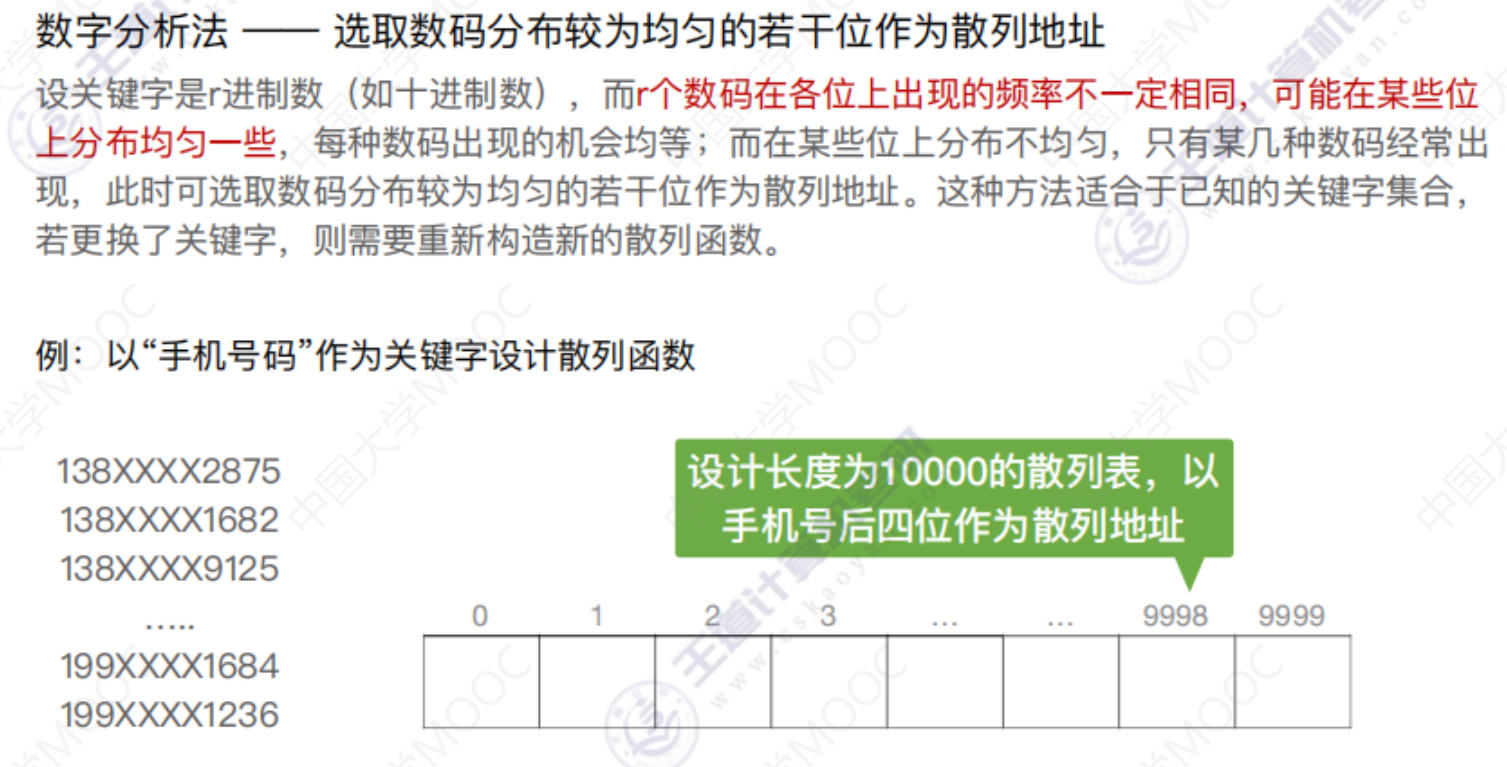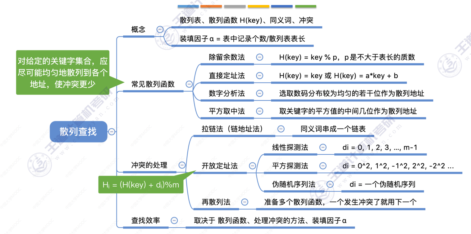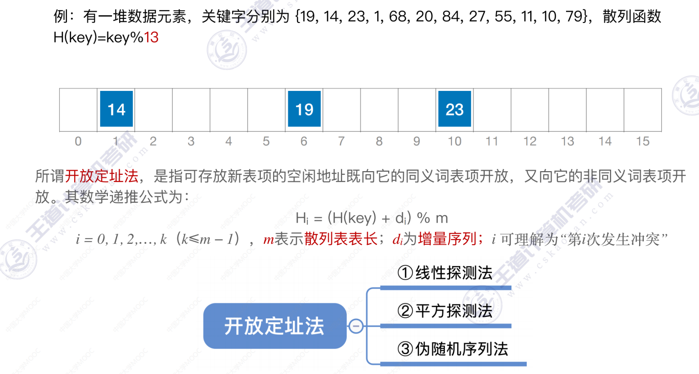 散列查找 散列查找散列表 处理冲突的方法—拉链法 散列查找 装填因子越大,表示装填的记录越“满”,发生冲突的可能性越大,反之发生冲突的可能性越小。 常见的散列函数 除留余数法–H(key) = key % p 直接定址法 –> H(key) = key 或 H(key) = a*key + b 数字分析法 –> 选取数码分布较为均匀的若干位作为散列地址 平方取中法 –> 取关键字的平方值的中间几位作为散列地址。 处理冲突的方法—-拉链法 处理冲突的方法—-开放定址法 删除操作 总结 数据结构 > 第七章 > 散列表 散列查找 https://lzyjx.github.io.git/2023/05/21/散列查找/ 作者 六只羊 发布于 2023年5月21日 许可协议 数据库 上一篇 B+树 下一篇